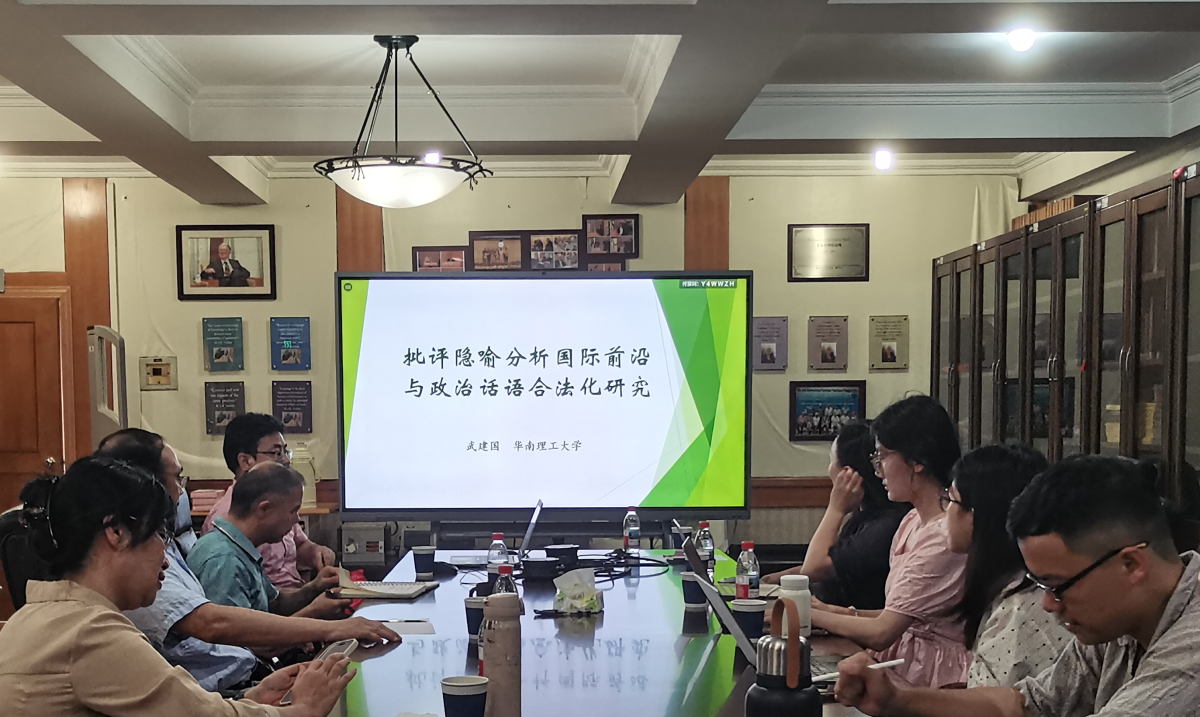 2025年9月30日下午,“韩礼德文献中心学术沙龙”第三十期讲座在足球投注平台 韩礼德文献中心(足球投注平台 222室)成功举办。本次沙龙邀请华南理工大学武建国教授主讲,讲座主题为“批评隐喻分析国际前沿与政治话语合法化研究”。中山大学王勇教授、何清顺教授、郭曼副教授、周文萱副教授,华南理工大学邓仁华教授等多位师生参加了此次沙龙。本次沙龙由中山大学功能语言学研究所主办,报告由何清顺教授主持。